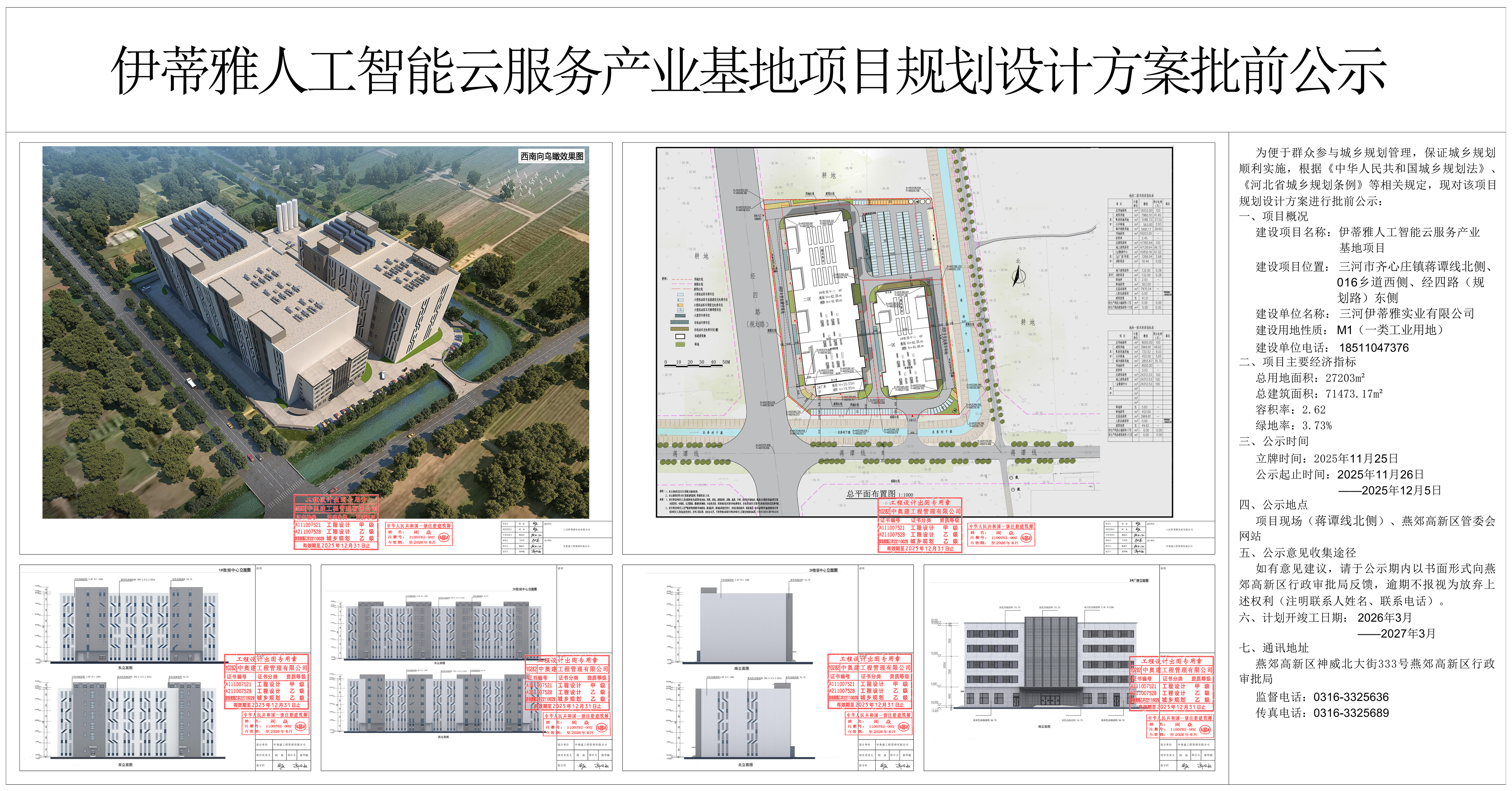 伊蒂雅人工智能云服务产业基地项目规划设计方案批前公示于2025年11月26日一2025年12月5日在项目现场(蒋谭线北侧),燕郊高新区管委会网站公示,如有意见建议,请于公示期内以书面形式向燕郊高新区行政审批局反馈,逾期不报视为放弃上述权利(注明联系人姓名、联系电话)。(方案有关指标以最终审批为准)。